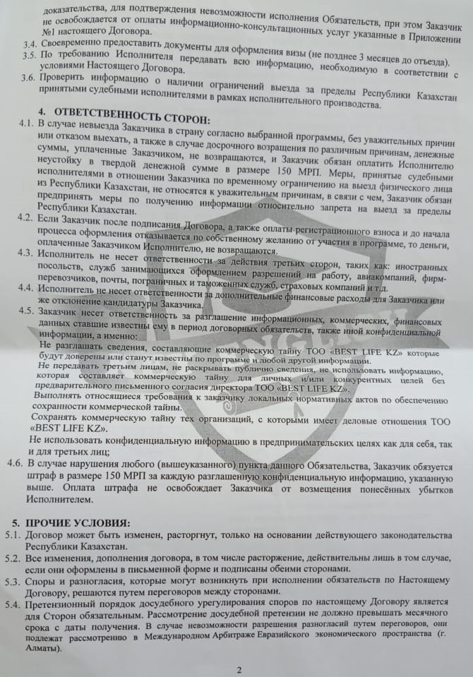 Обычно, деятельность в сфере трудоустройства за пределами Казахстана подразумевает, что компании становятся посредниками между гражданами РК и иностранными работодателями. Они ведут корреспонденции, обеспечивают встречи, связь с работодателями. То есть действия выходят за рамки одних лишь консультаций. И каждая обязанность компании должна указываться в договоре с упоминанием сроков выполнения, если это возможно предусмотреть.