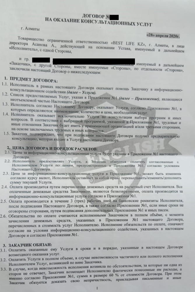 В договорах, который компания заключает с клиентами, не упоминается коммерческое название Key English. В них упоминались ТОО Best Life KZ и ИП "Джумагулова Газима". На сайте Kompra.kz учредителем ТОО Best Life KZ числится Абай Асанов. Юридический адрес в Алматы, телефон указан тот же, что и на сайте образовательного центра Key Engish. Компания является малым предприятием с численностью штата до пяти человек. ТОО имеет лицензию на осуществление туристской операторской деятельности. На сайте отмечены четыре судебных разбирательства, три из которых указаны как "Споры, связанные с заключением, изменением, расторжением договора (сделки) и исполнением договорных обязательств". Мы проверили их в судебном кабинете, и они оказались связанными с содействием в трудоустройстве за границу.