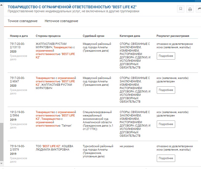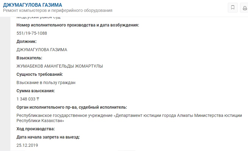 Если верить сайту Kompra.kz ИП "Джумагулова Газима" имеет долг по исполнительным производствам более 11 миллионов тенге. На сайте всплыло 20 судебных разбирательств ИП, почти все из них указаны как "Споры, связанные с заключением, изменением, расторжением договора (сделки) и исполнением договорных обязательств", как и у ТОО Best life KZ. Сама руководитель ИП имеет запрет на выезд из РК.