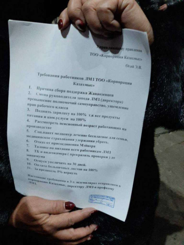 Сообщается, что митинг заводчан организован в поддержку протестующих в Жанаозене. Рабочие выдвинули перечень требований к компании "Казахмыс", среди них: смена руководителя завода за превышение полномочий и самоуправство; повышение зарплат на 100 процентов; изменение пенсионного возраста для работающих на предприятии; cоциальный пакет медуслуг для сотрудников и их семей.