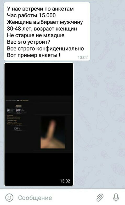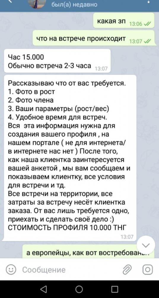 Как выяснилось, мужчинам предлагают зарегистрировать свою анкету за 10 тысяч тенге. Для этого необходимо выслать фото в полный рост, фото гениталий, параметры роста и веса, а также уточнить, в какое время он готов работать. Есть одно "но" - возрастные ограничения. Мужчины напрокат нужны только от 30 до 48 лет.