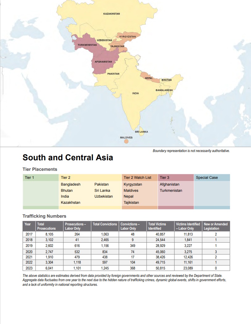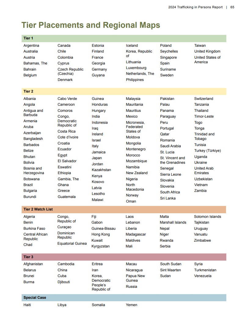 Согласно ежегодному отчёту Госдепартамента США о торговле людьми (Trafficking in Persons Report) странам присваивают один из трёх уровней в зависимости от их усилий по борьбе с преступлениями такого рода: