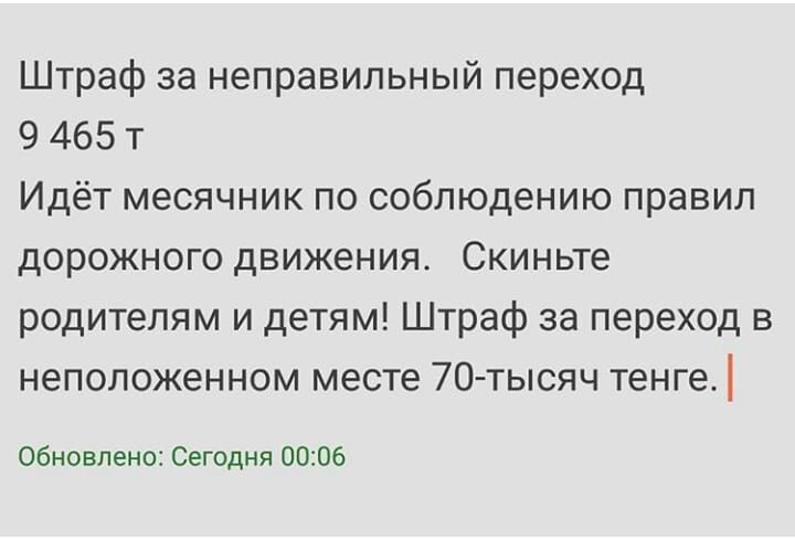 Во втором фэйковом сообщении говорится о том, что в связи с месячником, штраф за переход в неположенном месте – 70 тысяч тенге.
