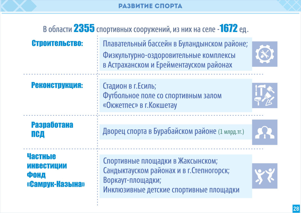 "В этом году реконструирован стадион в городе Есиль, близится к завершению строительство плавательного бассейна в Буландынском районе, футбольного поля со спортивным залом в городе Кокшетау. Возводятся физкультурно-оздоровительные комплексы в Астраханском и Ерейментауском районах", - отметил Малик Мурзалин.