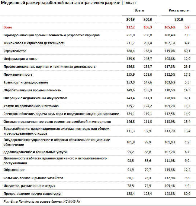 Комитет по статистике РК опубликовал данные по медианной и модальной заработной плате по итогам 2019 года. Согласно этим данным, половина (3,3 миллиона) трудоустроенных казахстанцев получают зарплату меньше 112,2 тысячи тенге — именно столько составило медианное значение заработных плат, передает BaigeNews.kzсо ссылкой ranking.kz.