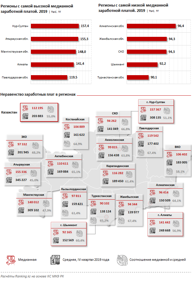 В Нур-Султане по итогам IV квартала 2019 года средняя зарплата составила 308,1 тысячи тенге, тогда как медианная — на 48,9% меньше: 157,4 тысячи тенге. В Алматы средняя зарплата находится на уровне 248,7 тысячи тенге, а медианная — 141,4 тысячи что меньше на 43,1%.