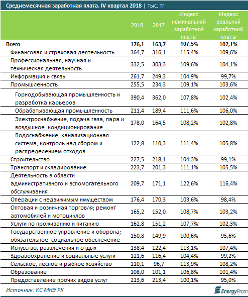 Между тем, на 4-й квартал 2018 года наибольшая среднемесячная заработная плата традиционно зафиксирована в Атырауской области — 320,5 тыс. тг (+11,2% за год), Мангистауской области — 278,7 тыс. тг(+3,4% за год) и в столице — 267,8 тыс. тг (+1,7% за год). Самые же высокооплачиваемые отрасли в РК по итогам IV квартала — финансовая и страховая деятельность (364,7 тыс. тг, на 15,4% больше, чем годом ранее), научная и техническая область (332,5 тыс. тг, +9,6% за год) и информационно-коммуникационная сфера (261,7 тыс. тг, +4,9% за год).