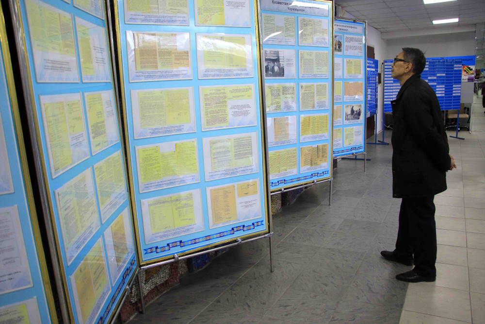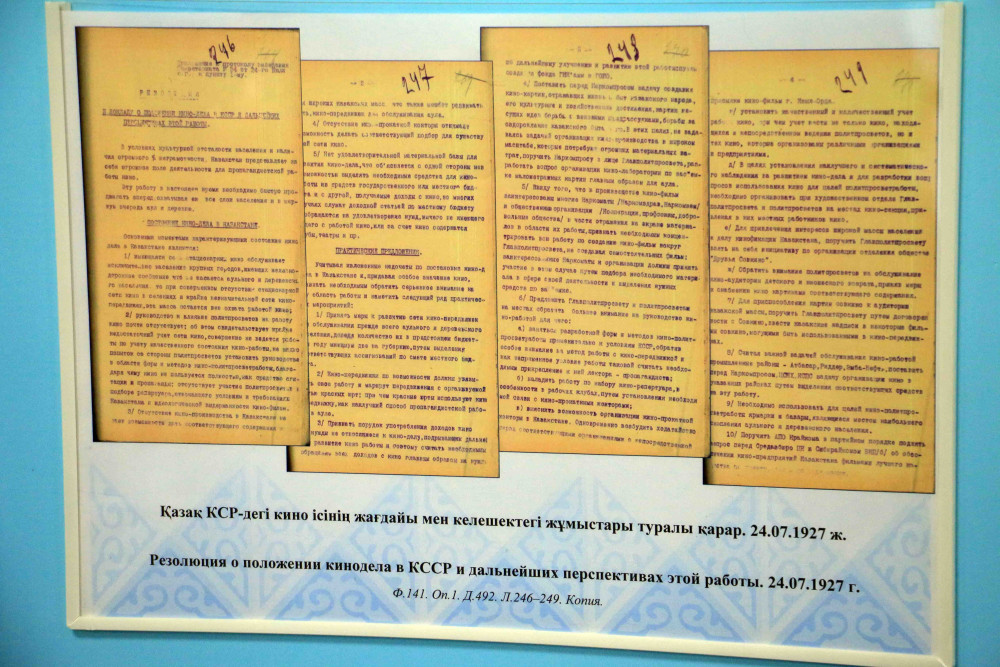 Выставка «Из истории кинематографа Казахстана» насчитывает более 50 экспонатов. Среди них раритетные материалы, рассказывающие о первых шагах отечественного кинематографа, о деятельности киностудий, стенограммы заседаний, обращения киноработников, документы о создании и развитии сети кинопрокатов, об организации работ по дубляжу, сценарии фильмов и многочисленные рецензии на них.