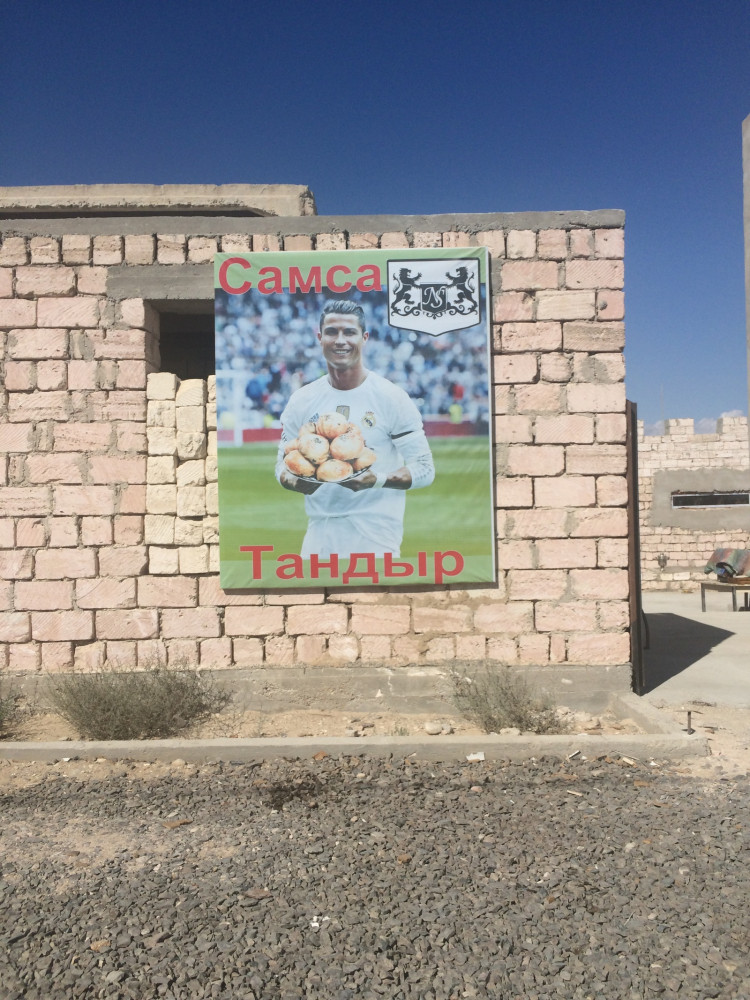 Звёзды футбола, нападающий ФК "Барселона" Лионель Месси и Криштиану Роналду из ФК "Реал Мадрид" рекламирует тандырную самсу в одном из посёлков Мангистау, передаёт "Лада".