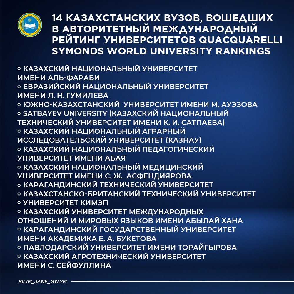 14 казахстанских вузов вошли в международный академический рейтинг Quacquarelli Symonds World University Rankings, который является одним из самых авторитетных рейтингов университетов во всем мире. Более того, в этом году некоторые вузы укрепили свои позиции, поднявшись на несколько строк, передает BaigeNews.kz.