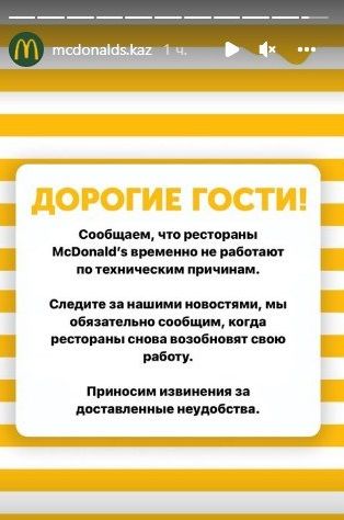 Рестораны сети быстрого питания McDonald's временно приостановили работу в Казахстане. Об этом сообщается в Instagram компании, передаёт BaigeNews.kz.