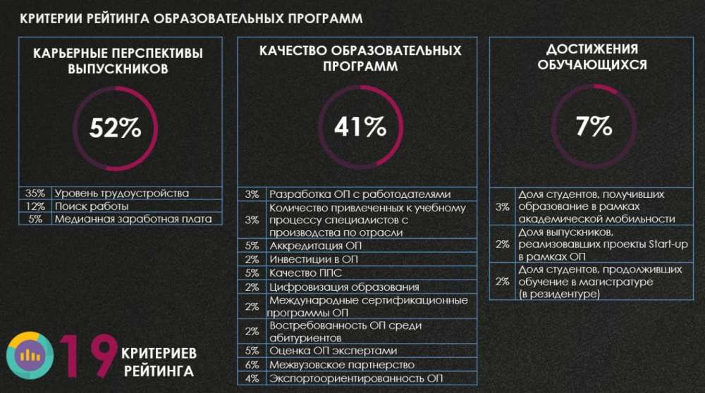 Председатель комитета по обеспечению качества в сфере образования и науки МОН РК Гулзат Кобенова отметила, что образовательные программы вузов оценивались по трем блокам (всего 19 критериев). Это будущая карьера выпускников, качество образовательных программ и достижения обучающихся. Исследование проводила НПП "Атамекен".