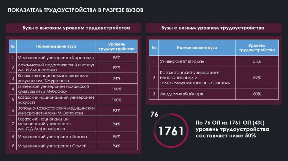 "Показатель удовлетворенности работодателей составил 50-55 процентов. Четыре года назад этот показатель составил 27 процентов. Рейтинг показывает, что 85 процентов образовательных программ вузов согласованы с работодателями. 88 процентов программ прошли аккредитацию в признанных аккредитационных агентствах. Количество трудоустроенных выпускников увеличилось на 12 процентов по сравнению с прошлым годом. Таким образом, в 2021 году занятость составила в среднем 77 процентов", - рассказала Кобенова во время онлайн-брифинга в СЦК.