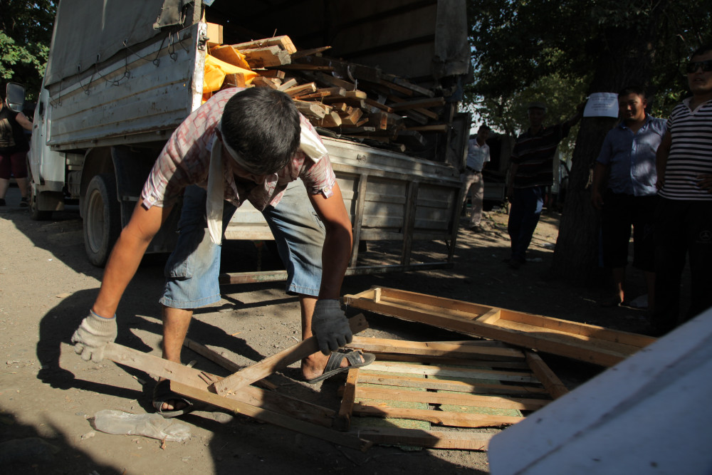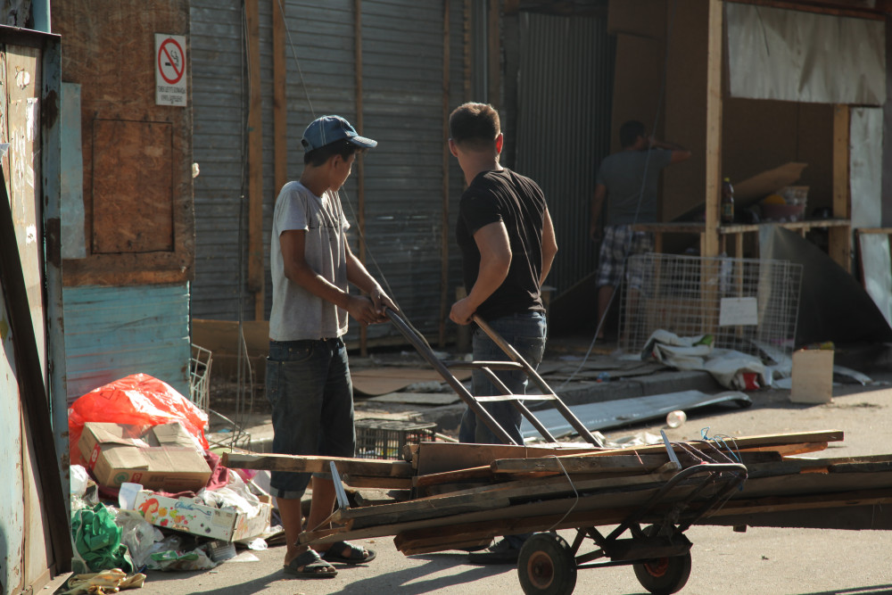 Сейчас здесь трудятся рабочие, они разбирают бутики, продавцы собирают оставшийся товар и вывозят его на грузовых машинах.