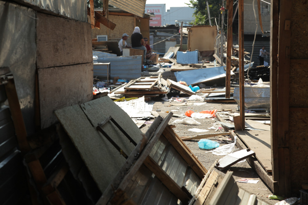 Сегодня здесь вместо рядов с обувью и одеждой лишь мусор, разбросанный товар и деревянные балки – это все, что осталось от бутиков. Акимат Алматы приступил к сносу стихийного рынка на автовокзале "Саяхат" сегодня, 15 августа.