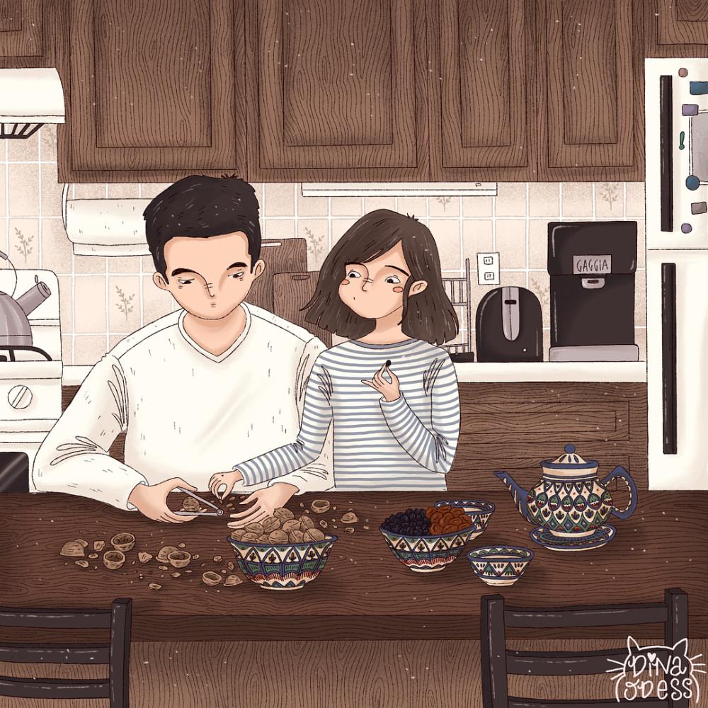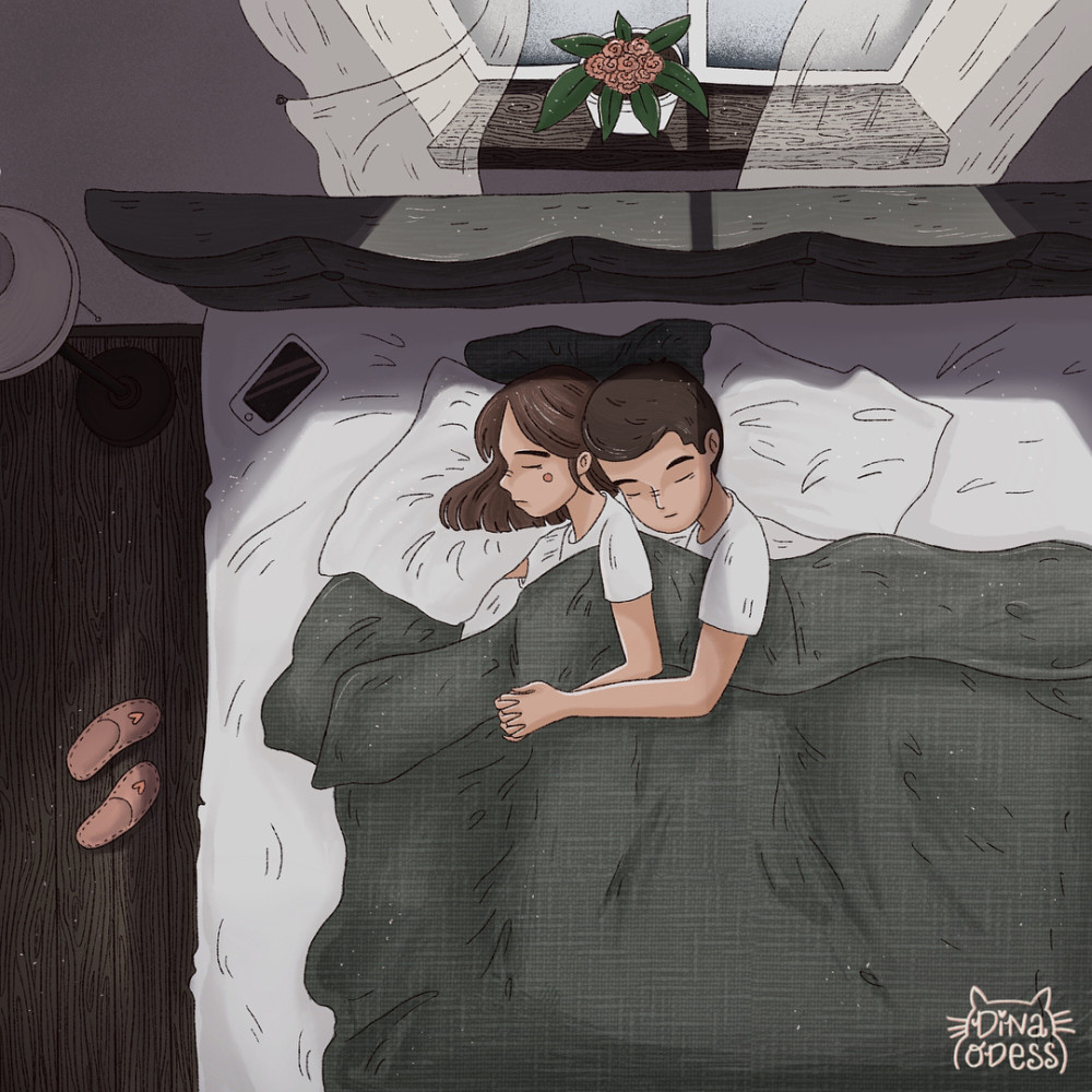 Дина Одесс (Dina Odess) — молодая художница из Казахстана, которая сейчас живет в Нью-Йорке. Она работает дизайнером интерьеров, а также занимается цифровой иллюстрацией. Недавно Дина Одесс начала интересный проект под хештегом #99relationshipillustrations. Девушка хочет опубликовать 99 иллюстраций об отношениях. Каждый рисунок — это момент из жизни влюблённых, фрагмент обычного дня, который стал особенным благодаря особенному человеку рядом.