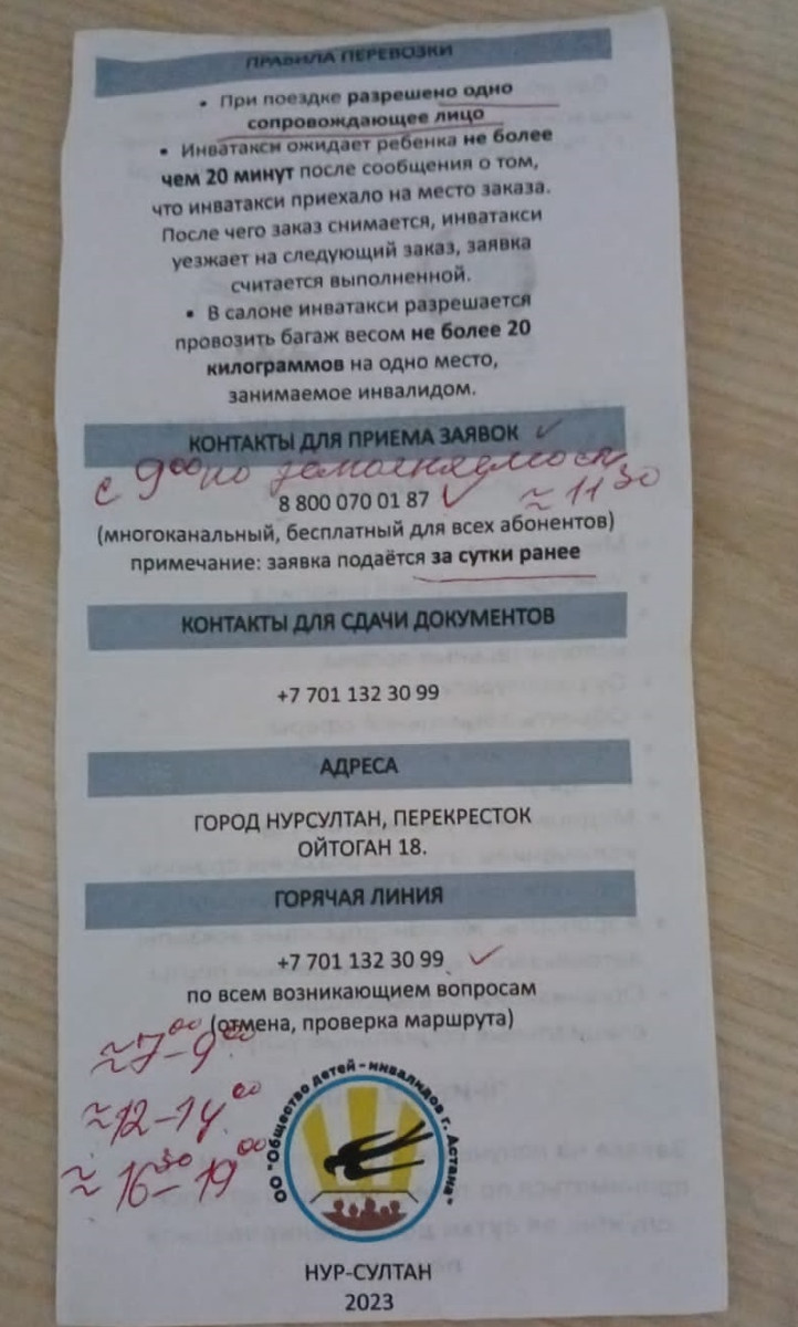 "Представляете, нас в Астане 1 200 получателей услуги инватакси. И все мы в это время начинаем дозваниваться до службы, чтобы заблаговременно оставить заявку. Если не удастся дозвониться, придется заказывать частное такси. А их услуги недешевые, съездить туда и обратно в день уже сумма приличная получается. Мы - родители возмущены качеством работы службы инватакси. Государством выделяются деньги, причем не малые, однако все эти годы нас обманывали, говорили, что инватакси работает только в будни. И только с 9.00 до 18.00. То есть нас не только ограничивали при приеме заявок. Хотя в правилах черным по белому прописано, что инватакси должно работать круглосуточно и в выходные, и в праздники", - рассказывает мама мальчика.