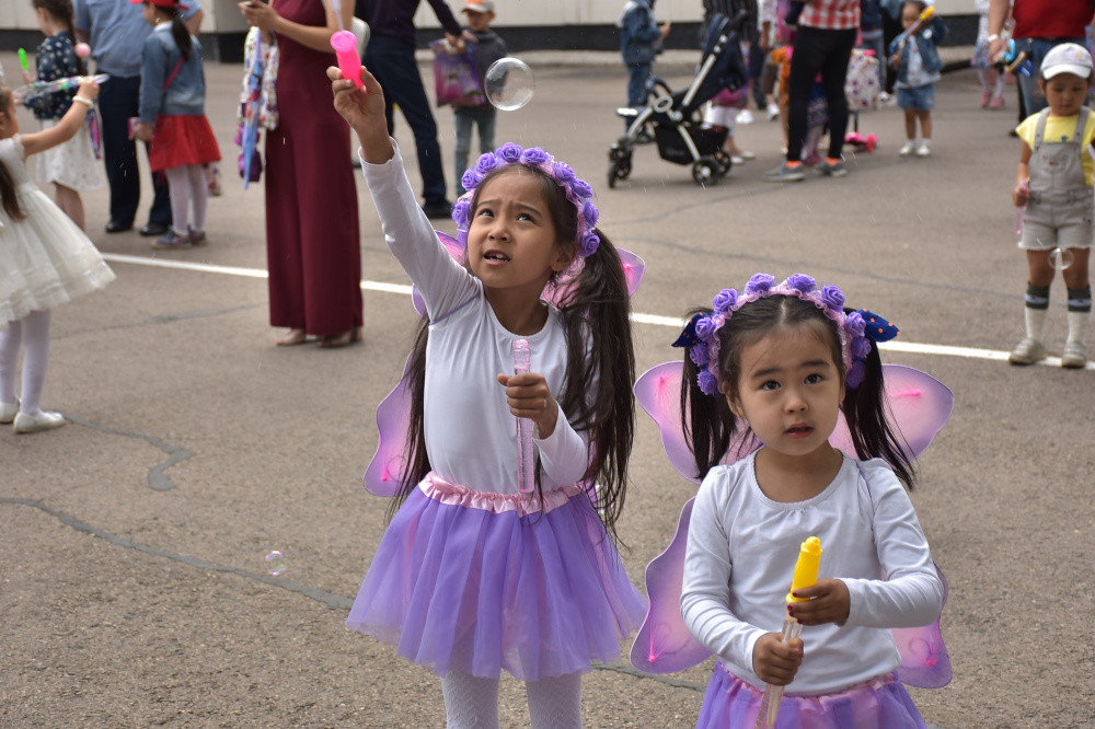 После теплых поздравительных слов, дети разделились на две команды. Пока одни воплощали мелом по асфальту свое видение на тему "Я и мой Казахстан" и соревновались в спортивных конкурсах за звание лучшего, другие с любопытством слушали концертную программу, танцевали и подпевали.
