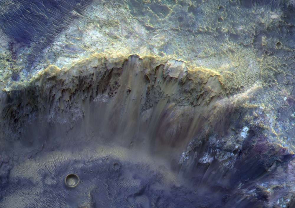 "Цветные фильтры камеры CaSSIS позволяют увидеть разнообразнейшую палитру красок. Это разнообразие обусловлено присутствием различных минералов, которые по-разному отражают свет на разной длине волны. Светлые залежи указывают на выход коренных пород, которые могут содержать в себе древние глинистые минералы, сформировавшиеся в присутствии воды. Кроме того, здесь также хорошо видны нанесенные ветром песчаные отложения, создающие "рябь" на дне кратера. Их характерный рыжевато-коричневый оттенок указывает на наличие оксидов железа", − говорится в пояснении к фото.