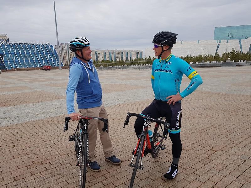 Вчера состоялась съёмка первого эпизода в торгово-развлекательном центре "Хан Шатыр". Сегодня ведущий программы проехался на велосипеде вместе с казахстанским олимпийским чемпионом Александром Винокуровым.