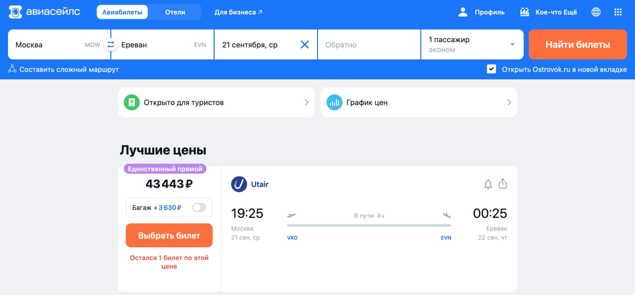 Билеты на рейсы из Москвы в Ереван и Стамбул на 22 сентября на сайтах ещё продаются.