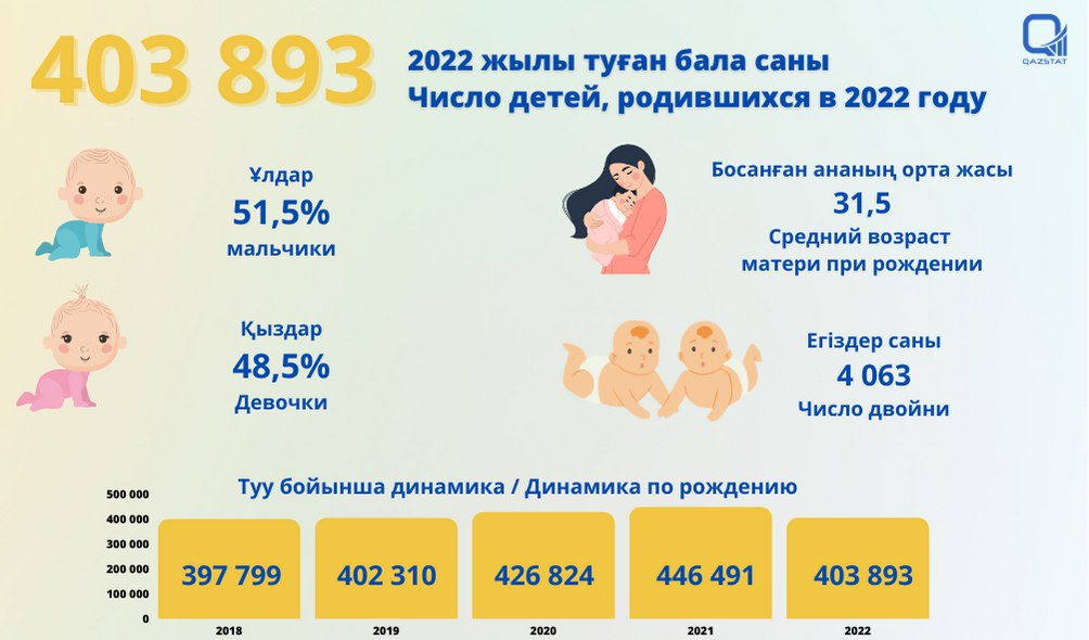 "Общий коэффициент рождаемости в 2022 году составил 20,57 на 1000 человек, в 2021 году он был на уровне 23,5. Наибольшие уровни рождаемости отмечены в Мангистауской (28,53), Туркестанской (27,67) областях и Шымкенте (27,13)", - сообщили в бюро.