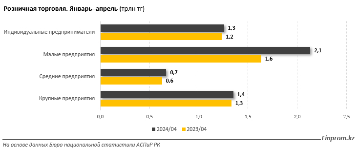 Объёмы розничной торговли индивидуальных предпринимателей и крупных предприятий почти равны: 1,3 трлн и 1,4 трлн тг соответственно. При этом объём торговли у ИП вырос на 1,7%, у крупных предприятий — на 1,4%.