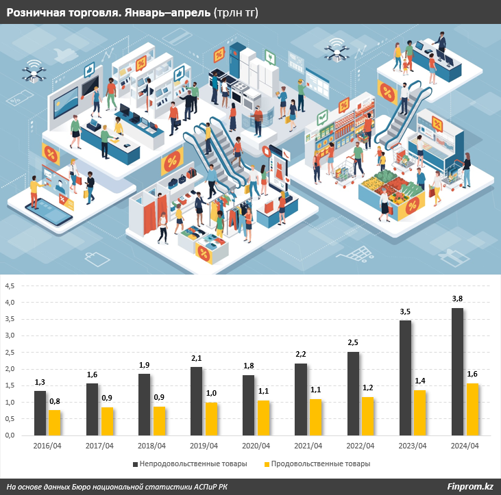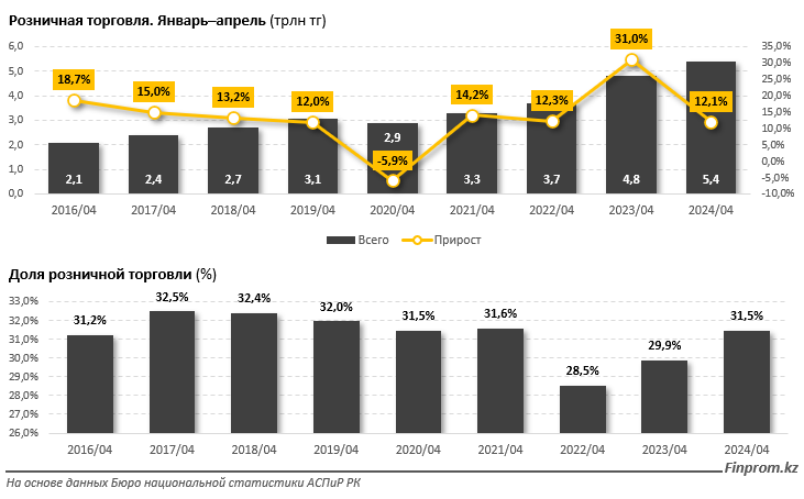 Объём розничной торговли в Казахстане за январь–апрель 2024 года достиг 5,4 трлн тг — на 12,1% больше в денежном выражении, чем за аналогичный период 2023-го (ИФО — 105,2%), передаёт BaigeNews со ссылкой на Finprom. Годом ранее наблюдался рост сразу на 31% в денежном выражении (ИФО — 110,5%).