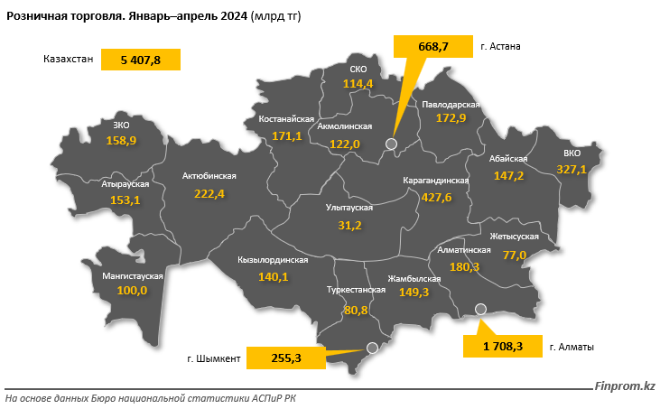 Наименьшие объёмы розничной торговли пришлись на Улытаускую (31,2 млрд тг), Жетысускую (77 млрд тг) и Туркестанскую (80,8 млрд тг) области.