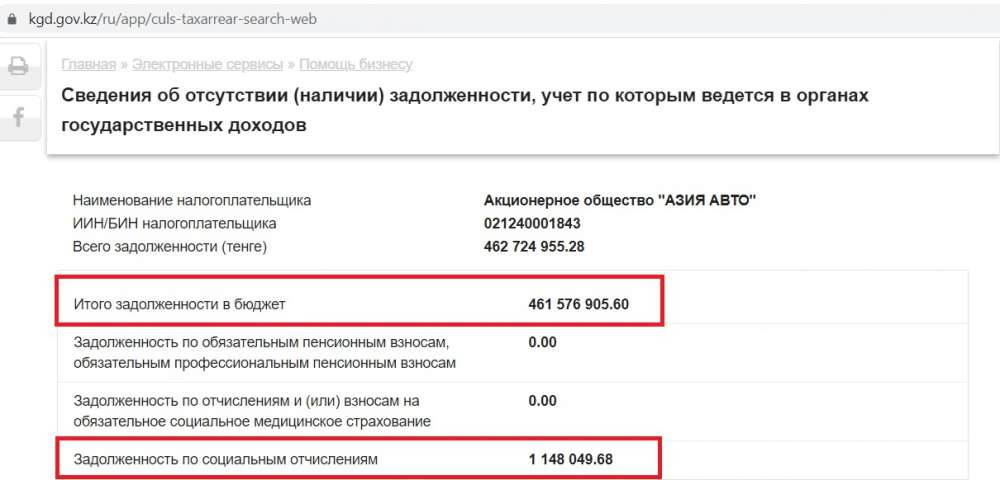 Долг автохолдинга перед государством. Скриншот с сайта КГД