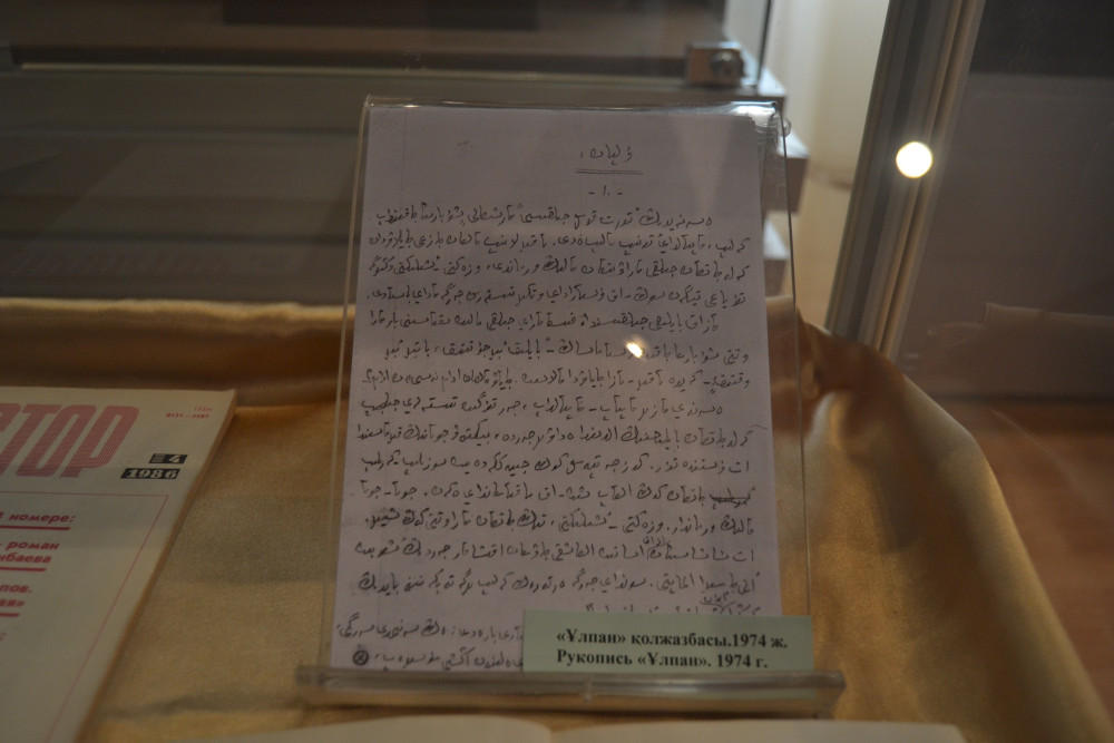 Также она рассказала об интересных фактах из жизни писателя. Все свои книги он писал арабским шрифтом и только простым карандашом. Например, рукопись романа «Улпан» состоит из 240 страниц, одна из страниц находится на выставке.