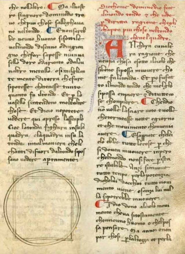 Кроме того, на рукописях изображен квадрат, наложенный на круг. Ученые отмечают, что именно эту концепцию Данте позже использовал в "Божественной комедии" для описания Бога.