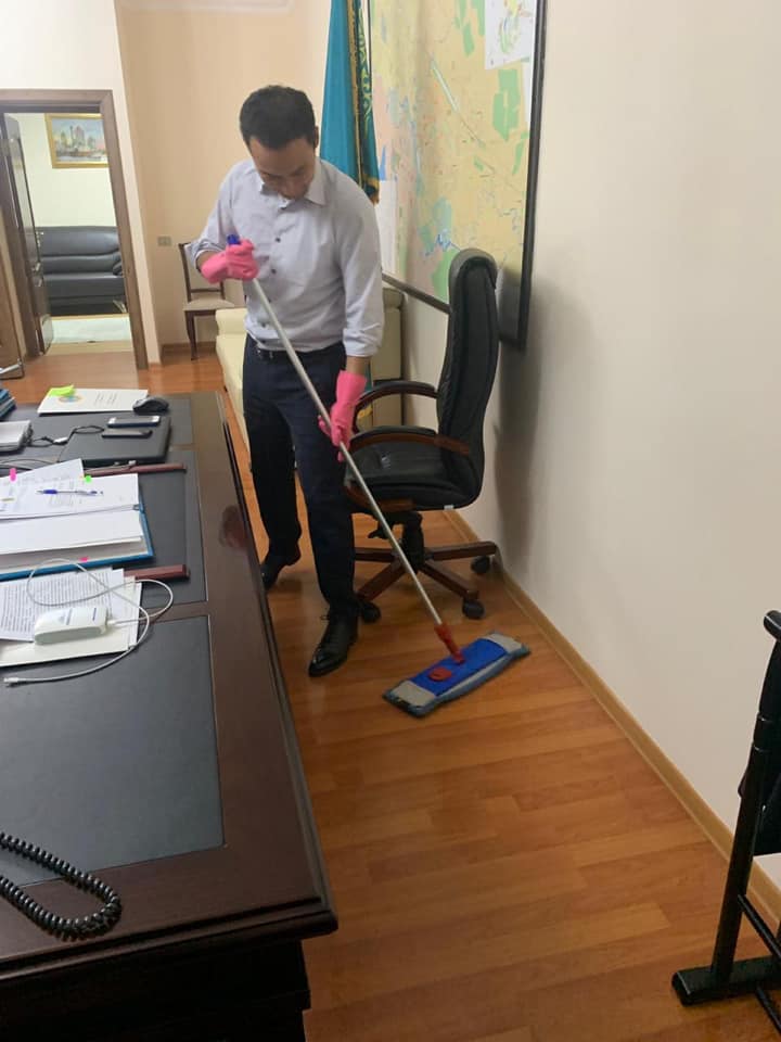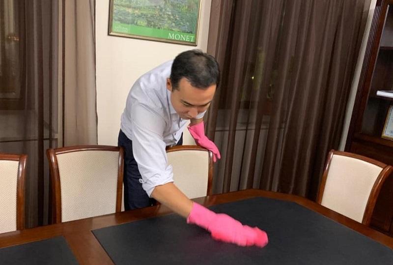 Чиновник примерил розовые резиновые перчатки и устроил уборку в кабинете, фиксируя происходящее на камеру. Своим поступком Жангозин решил показать пример школьникам, передает BaigeNews.kz.