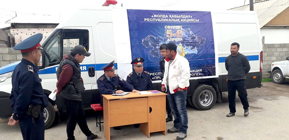 Руководство дорожной полиции Жамбылской области в лице заместителя начальника Департамента полиции Серика Джунисбекова и других полицейских чиновников с утра 5 апреля ведёт разъяснительную работу с населением в рамках республиканской акции «Приемная на дороге».
