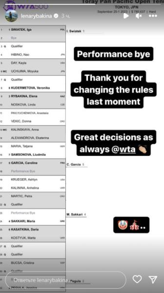 "Спасибо, что изменили правила в последний момент. Как всегда отличное решение от WTA", — написала Рыбакина в "сторис" инстаграма, добавив эмодзи аплодисментов и клоуна.