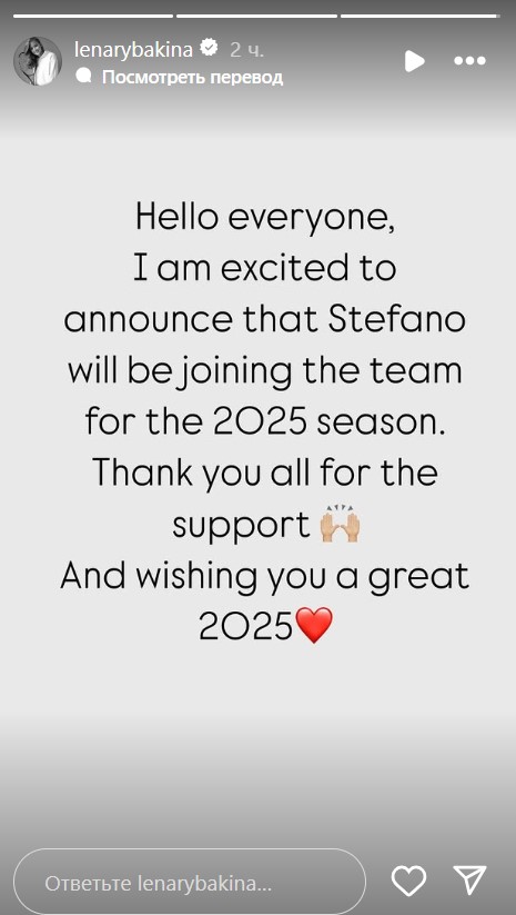 "Всем привет. Я рада объявить, что Стефано присоединится к моей команде в сезоне-2025. Спасибо всем вам за поддержку. И желаю отличного 2025 года!" — написала Рыбакина в сториз в Instagram.