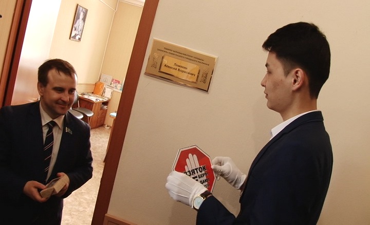 Напротив каждого кабинета в акимате активисты наклеили предупреждающий знак "Взяток не беру и не даю". В ходе акции молодые люди также напомнили чиновникам, что в этом году Казахстан вышел из числа самых коррумпированных стран мира и поднялся на девять позиций.