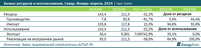 Тем временем экспорт и реэкспорт сахара вырос за год с 700 кг до 50,4 тыс. тонн за первые четыре месяца этого года. А вот реализация на внутреннем рынке за год сократилась в 2,3 раза и составила всего 93 тыс. тонн.