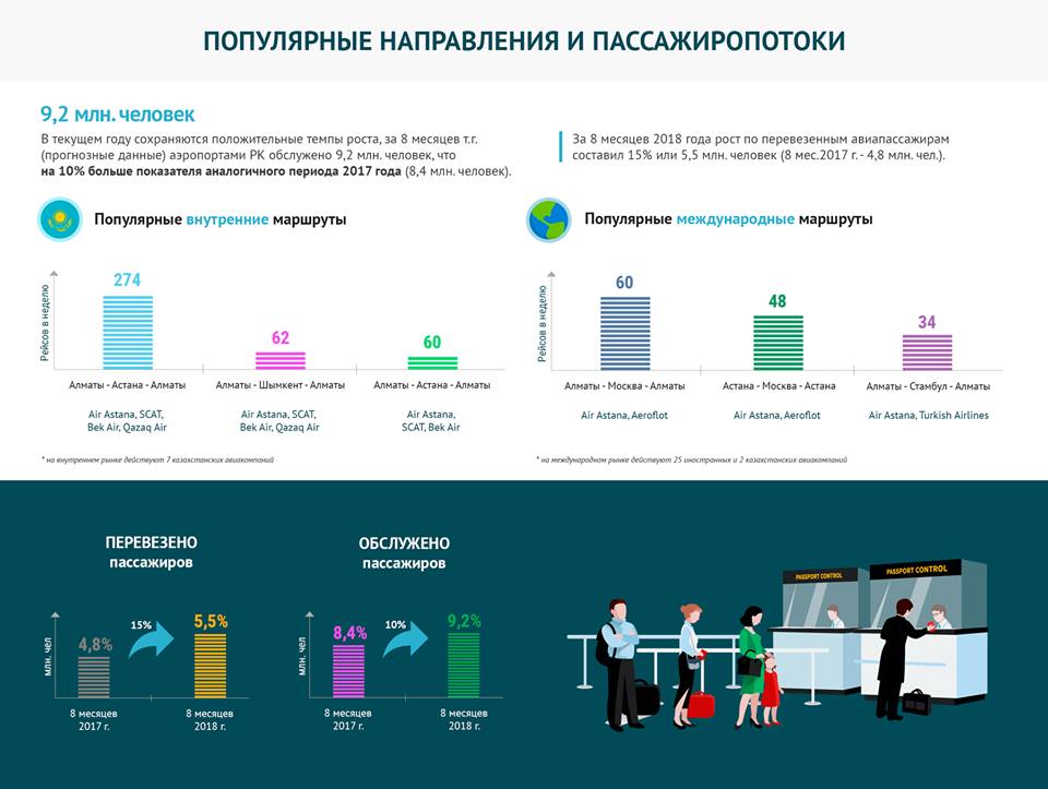 В 2018 году сохраняются положительные темпы роста в отрасли гражданской авиации Казахстана. Так, за 8 месяцев 2018 года местными аэропортами обслужено 9,2 млн человек (прогнозные данные), что на 10% больше показателя аналогичного периода 2017 года (8,4 млн человек).