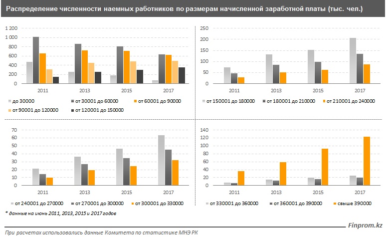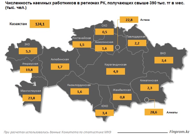 По данным комитета по статистике, в стране насчитывается порядка 124,1 тыс человек, получающих заработную плату в размере свыше 390 тыс тенге в месяц. Это на 30,8 тыс человек больше, чем было зафиксировано два года назад.