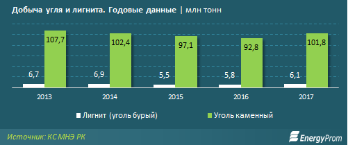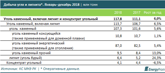 От общего объёма добычи угля и угольного концентрата на лигнит пришлось всего 5,5% (6,4 млн тонн), на каменный уголь — сразу 91,1% (107,3 млн тонн). При этом основную долю каменного угля — 81% составил энергетический уголь (87 млн тонн), и лишь 10% — коксующийся (10,8 млн тонн).