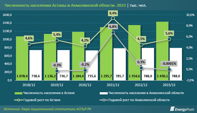 Статистики сообщают, что численность граждан Астаны с 2018-го по 2023 годы выросла на 32,6%, с 1,1 млн до 1,4 млн человек. За прошлый год столица пополнилась 75,6 тыс. человек. Рост составил 5,6%. Такие темпы можно сравнить только с южной столицей.