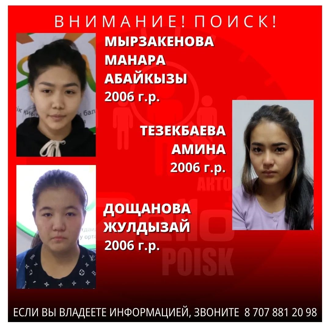 В ориентировке отмечается, что все три воспитанницы центра 2006 года рождения. По данным паблика, она сбежали без верхней одежды. Пропали Мырзакенова Манара Абайкызы 5.06.2006 года рождения, Тезекбаева Амина 2006 года рождения и Дощанова Жулдызай 6.10.2006 года рождения.