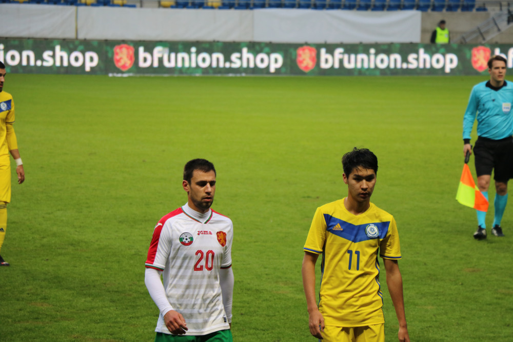 Казахстанцы хорошо начали матч, владели инициативой, однако на 24-й минуте дебютант сборной Суинбаев привёз пенальти. Главная звезда болгарской сборной Ивелин Попов уверенно реализовал одиннадцатиметровый. Попов пробил в "девятку", лишив каких-либо шансов Плотникова.