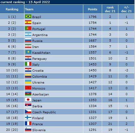 Первое место в рейтинге заняла команда Бразилии, у нее 1796 очков. На второй позиции Испания с 1754 очками. Замыкают тройку Португалия и Аргентина, записавшие на свой счёт по 1744 очков.