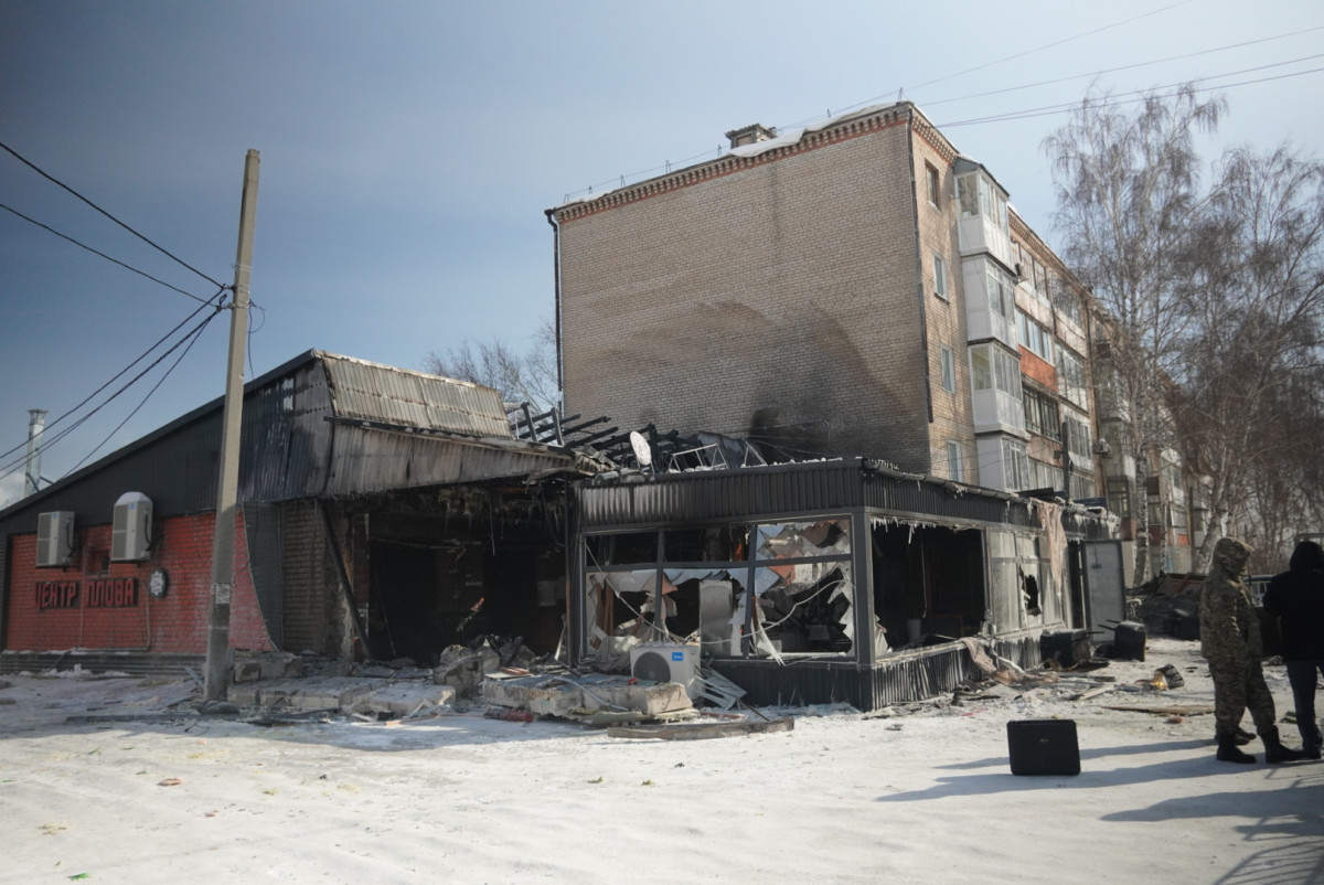 Одноэтажное кафе сильно повреждено взрывом и огнём. Ударная волна выбила окна, разрушены части конструкций. На месте продолжают работать спасатели и полиция.