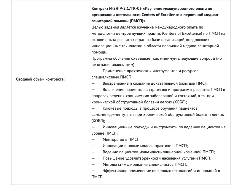 На изучение международного опыта по методологии центров лучших практик (Centers of Excellence) по ПМСП на основе опыта развитых стран на базе организаций, внедряющих инновационные технологии в области первичной медико-санитарной помощи, ФОМС потратил уже не в тенге, а в американской валюте. За четыре месяца услуги французской компании "Dialog Consulting" обошлись в 143 000 долларов. Ниже перечень услуг за 58,6 миллиона тенге по сегодняшнему курсу:
