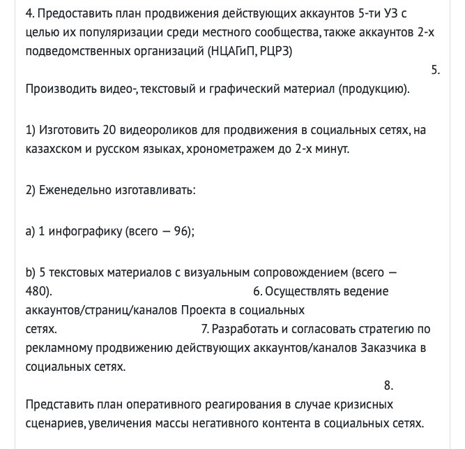 Информационную кампанию в социальных сетях (Social Media Marketing – SMM) с визуальным сопровождением казахстанским пиарщикам уже не доверили, отдав 209 008 долларов (свыше 85 миллионов тенге по нынешнему курсу) украинской компании ООО "Фирма 800". За эту сумму заграничным smm-специалистам необходимо провести анализ присутствия аудитории в социальных сетях и обучающие семинары. В перечень также вошли видеоролики и инфографики. Вести соцсети Минздрава "Фирма 800" должна до 2021 года.