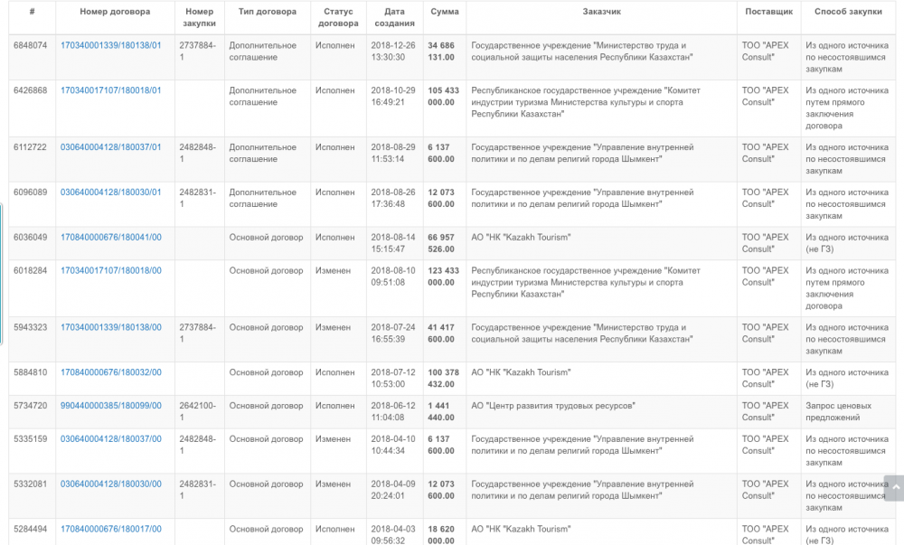 Еще один вид услуг - соцопросы за 110 056 120 тенге, которые достались ТОО "APEX Consult". В течение двух лет, начиная с ноября 2018 года, компания взялась проводить в Казахстане социологические опросы и репутационный аудит по системе обязательного социального медицинского страхования. С результатами официального опроса ознакомиться не получилось, ввиду его отсутствия в Интернете. Поэтому о деятельности компании остается судить по налогам и участию в тендерах.