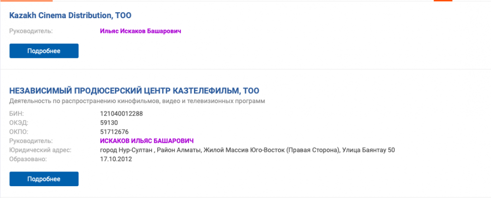 Он также руководит ТОО Kazakh cinema distribution, которое занимается производством кино-, видеофильмов и телевизионных программ, и участвовал в госзакупках.